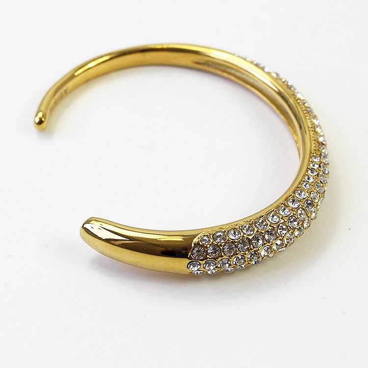 緩やかに幅が変わるアシンメトリーなオープンバングル。クリスタルガラスを敷きつめたエレガントで華やかな着脱しやすいデザインです。パーティーシーンはもちろん、あえてカジュアルな装いにご使用いただくことでコーディネートを引き締め、大人カジュアルにご利用いただけます。