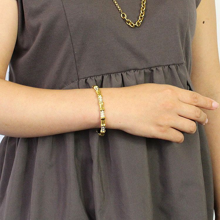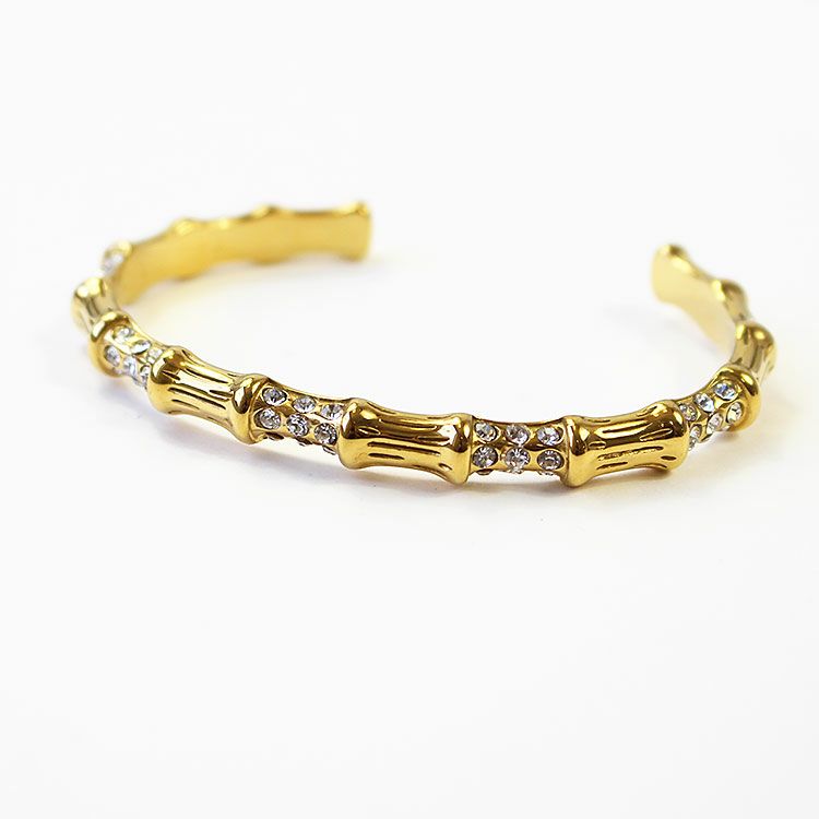 バンブーモチーフにクリスタルガラスをあしらったエレガントで華やかなオープンバングル。着脱しやすいデザインです。パーティーシーンはもちろん、あえてカジュアルな装いにご使用いただくことでコーディネートを引き締め、大人カジュアルにご利用いただけます。