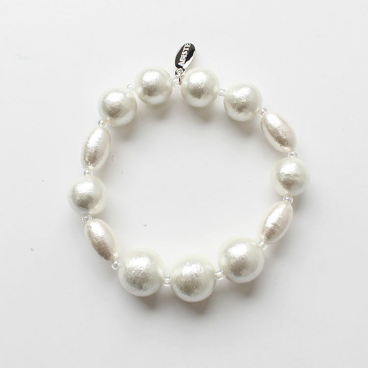やさしげな肌触りと独特の風合いが魅力の、コットンパールのブレスレット。ゴム式のため着脱もスムーズ。パーティーからデイリーまで幅広くご使用いただけます。