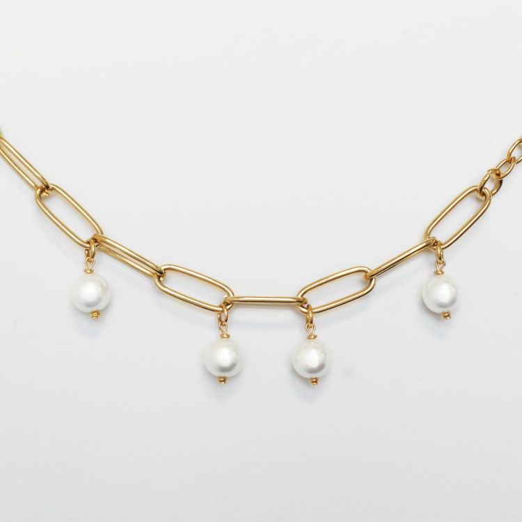 線が細く大ぶりなチェーンにマヨルカ島で作られたパールを組み合わせたゴールドカラーのチェーンブレスレット。
