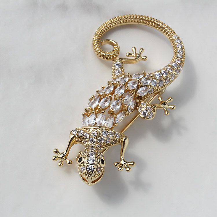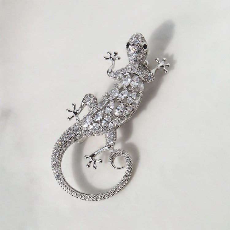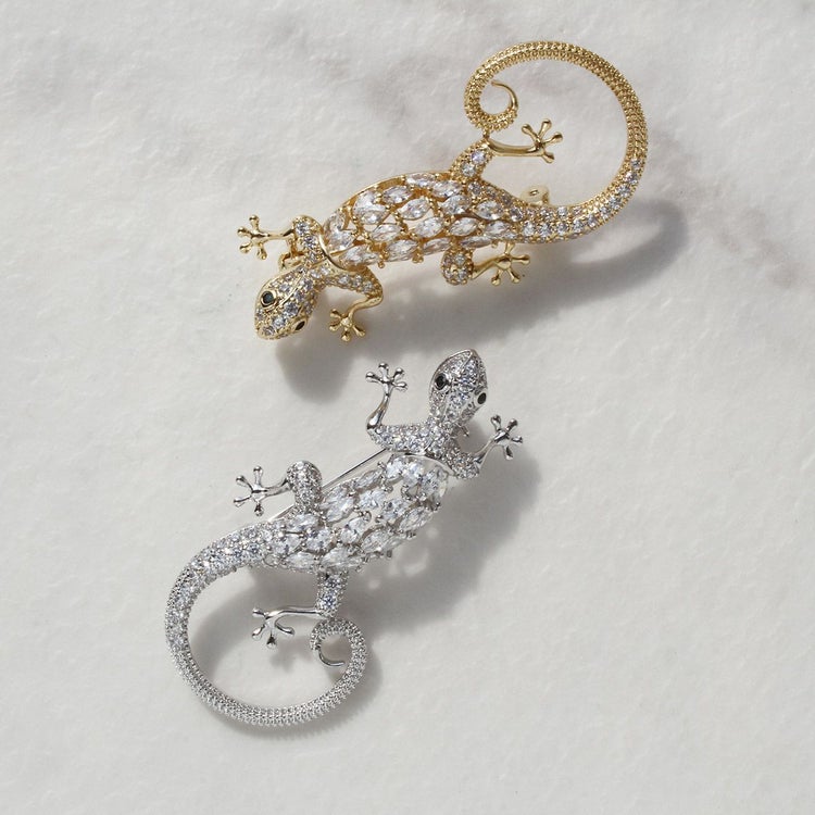 ちょっぴり気の抜けた、なんだか楽しそうな表情が愛らしいゲッコー(ヤモリ)をモチーフにしたユニークなブローチ。ヤモリは「家守」と日本では広く知られていますが、「知恵」「家の繁栄」「富の象徴」「復活」を意味すると言われ、世界中のあちこちで幸運のシンボルとして親しまれているラッキーモチーフです。