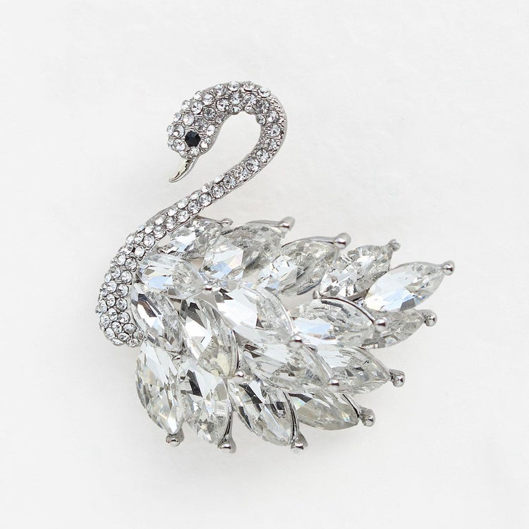 美しい白鳥をモチーフにしたブローチ。大粒のリーフ型クリスタルガラスで立体的に作られた羽が華やかなデザインです。