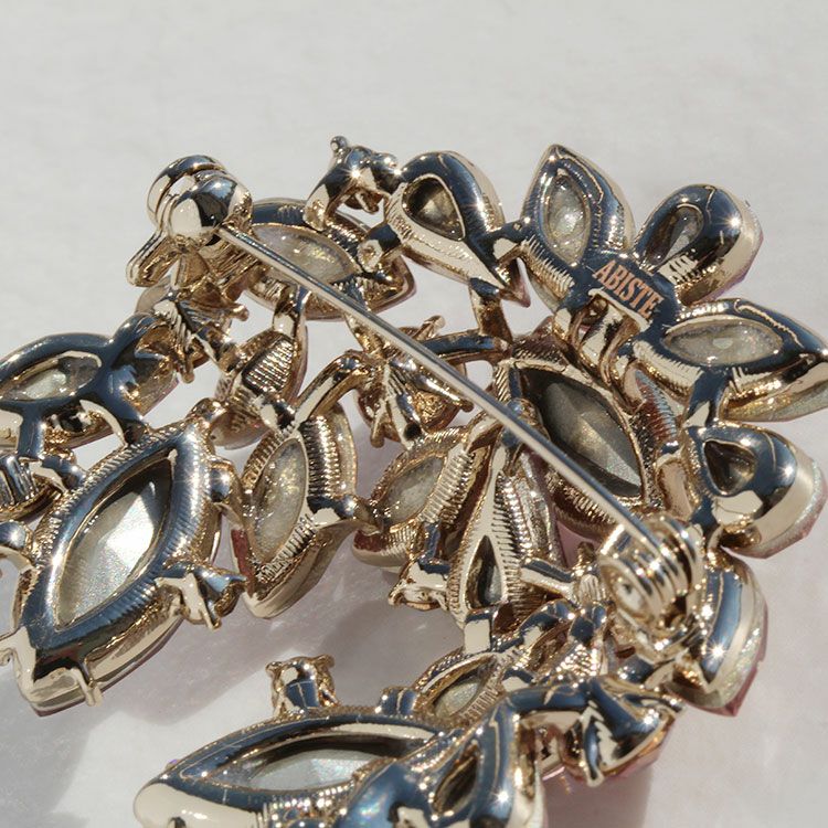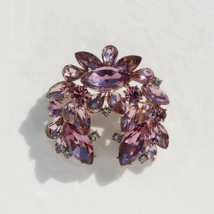 品良く華やかなカラーのストーンを用いたビジューブローチ。ジャケットやスーツ、コートの襟元のほか、マフラーやストールの飾り、シャツの襟の中央に付けるのもおすすめです。