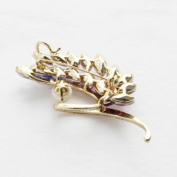 華やかな大ぶりブローチ。華やかなデザインとサイズ感ながら、パープルグラデーションのストーンが程よく落ち着いた上品な印象を与えてくれます。青みパープルと赤みパープルのストーンを組み合わせているので、合わせる洋服の色味を選ばないのも、さりげなくも大きなポイント。
