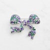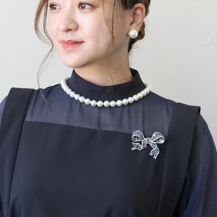 普段使いもセレモニーにも使いやすく人気のリボンモチーフブローチ。風に揺れるリボンのような柔らかいフォルムが繊細でフェミニン。パープルとグリーンのストーンを組み合わせることでシックで上品な印象をプラスされているので、甘さ控えめのファッションがお好きな方にもおすすめできるデザインです。
