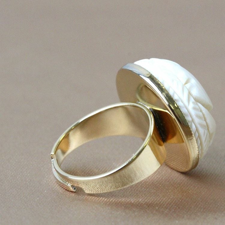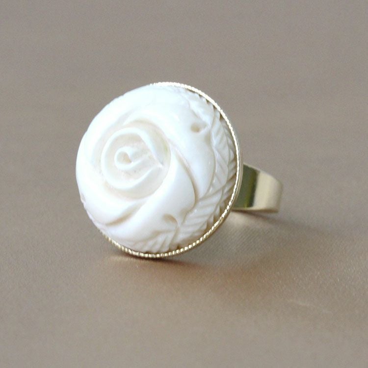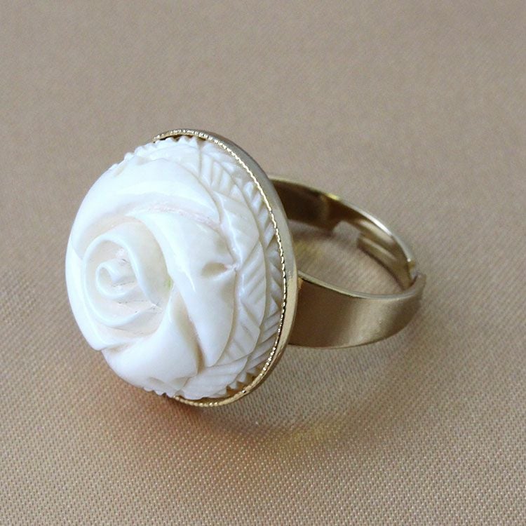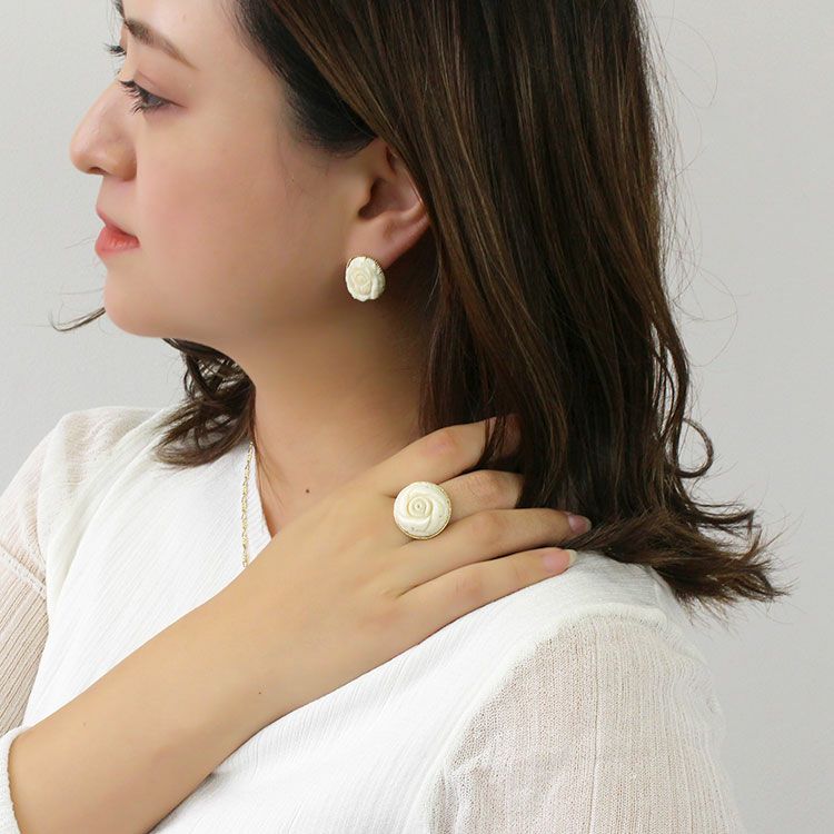 約3万年前の氷河期に生息していたマンモスの牙を使用し、大きなローズモチーフを彫り込んだリング。職人の技術力の高さが伺えるひと品です。