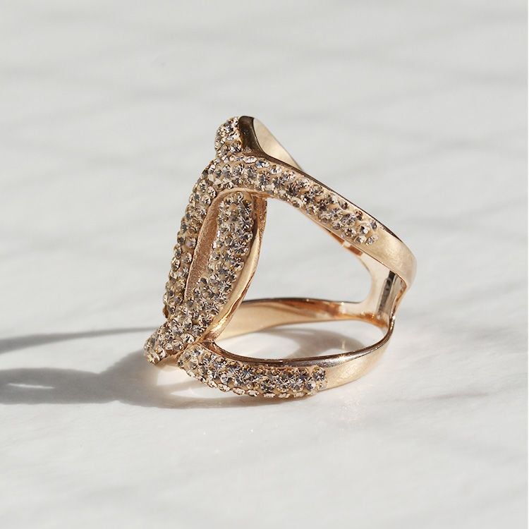 チェコクリスタルの緩やかなウエーブが交わり、結ばれた様な立体的でスタイリッシュなデザインのクロスリング。