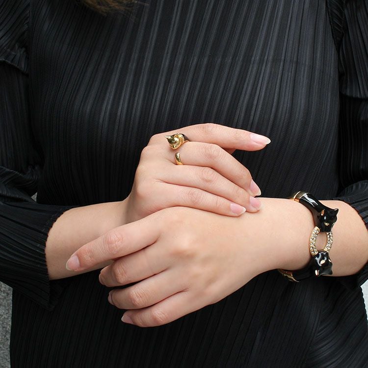 クリスタルガラスの瞳が輝くキャットモチーフが愛らしいリング。クラス感のある個性的なデザインなので、可愛らしくなりすぎずにモードな印象を与えてくれます。リング部分は厚みが控えめなので、違和感のない付け心地なのも嬉しいポイント。