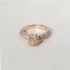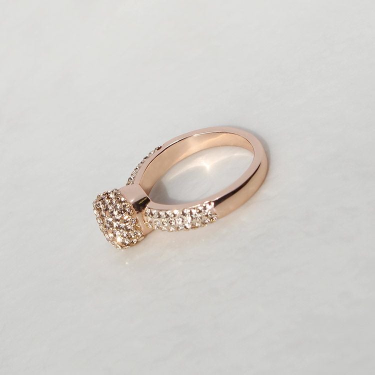 台座にはスクエアモチーフが煌々と輝くカクテルリング。リングにはチェコクリスタルがパヴェ状に敷き詰められ、エッジは丸みがあり柔らかな印象。