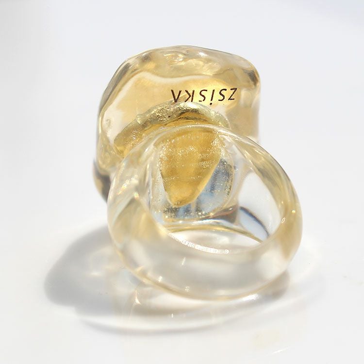 アートのような変形したフォルムがニュアンスのあるレジンリング。キラキラと光を反射するレジンに銀箔、金箔がアクセントになって、ラグジュアリーで、モードな雰囲気を印象付けています。どの角度から見てもこなれ感あるデザインは、デイリー使いはもちろん、パーティーシーンにもおすすめです。