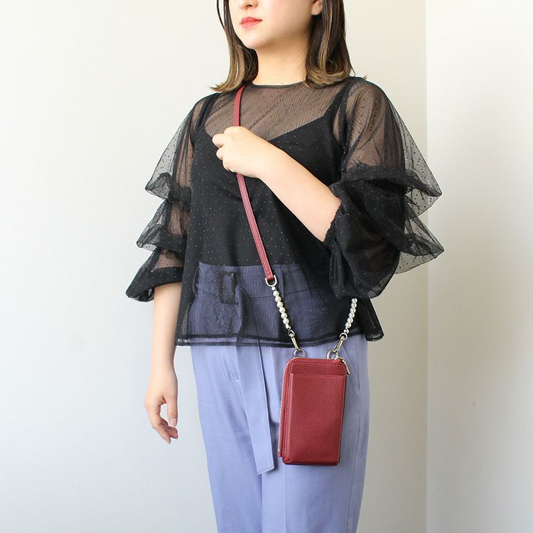 長さ調節可能なストラップにはパールをあしらい、カジュアルになりがちなフォンポーチに大人のエレガントな要素を投入。さらに、明るすぎないカラーもポイント。ダークなレッドは様々なカラーとの相性が良く、ぐっとおしゃれ度を上げてくれます。