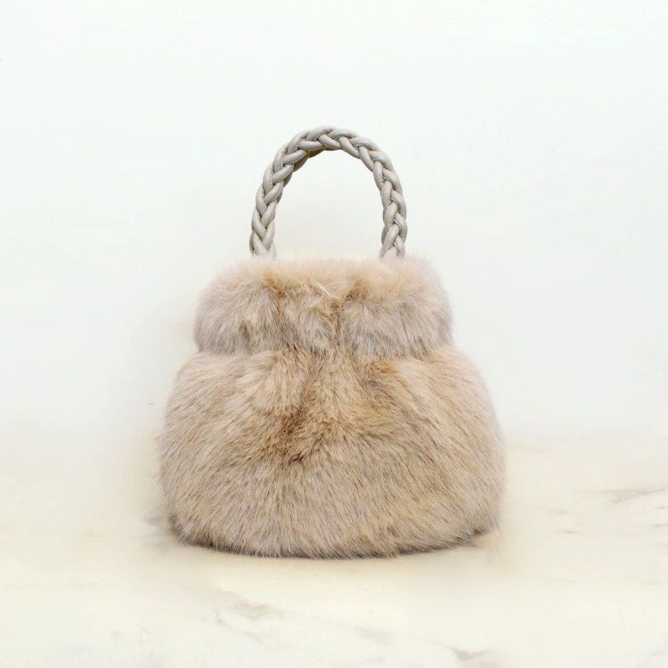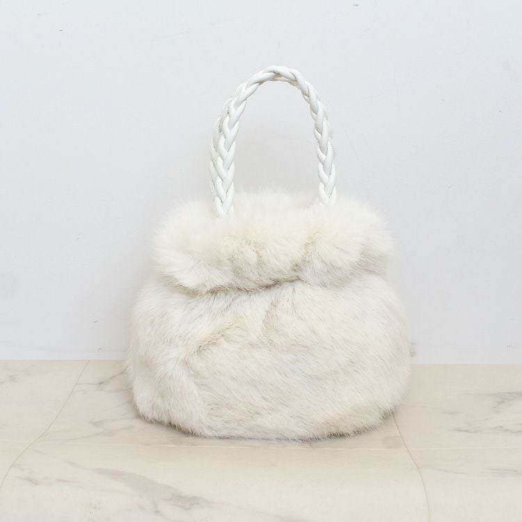 コロンと丸みのあるシルエットが大人かわいいふわふわのエコファーバッグ。エコレザーを編み込んだハンドルでかわいらしさをUPしています。開閉部分はゴムで巾着のように絞ったデザインにマグネットボタンが付いているので、人混みや移動中も安心。チェーンをつければショルダーバッグとしてもご利用いただける2way仕様です。内側にはポケット2つ付き。小ぶりながらしっかりとマチがあり、貴重品やコスメポーチなど日常に必要な量のお荷物を十分に収納できるサイズです。