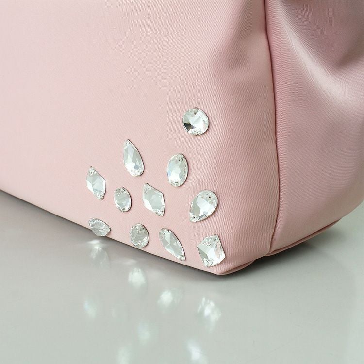 撥水加工のナイロンとレザーにアビステらしいキラキラのビジューを組み合わせたバッグ。とても軽くて付属のショルダーストラップを使えば両手が空く、普段使いから旅行まで活躍間違い無しの便利なアイテムです。手回り品はきちんと収まるサイズ感にファスナーポケットや大きく開く開口部と、使い勝手の良いポイントがたっぷり。