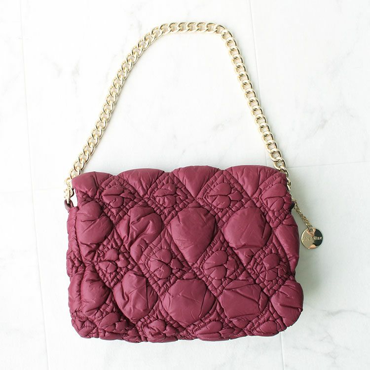 イタリア・フィレンツェに拠点を構える、兄弟からなるブランド Alex Max のバッグ。ダイヤの内側に、横向きにハートを配したキルティング生地の表面はさらさらとした質感。大人が使いやすい品のあるカラーリングに、ゴールドメタルのチェーンとブランドチャームを合わせました。レザーライクなショルダーベルトが付属しており、マルチな使い方が楽しめます。