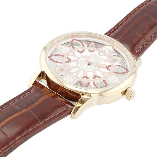 お花柄の透かし模様が軽さと透明感をプラス。上品にあしらわれたクリスタルガラスと型押しベルトが大人の気品を漂わせます。
