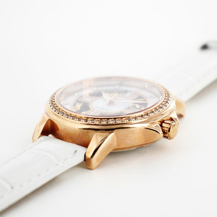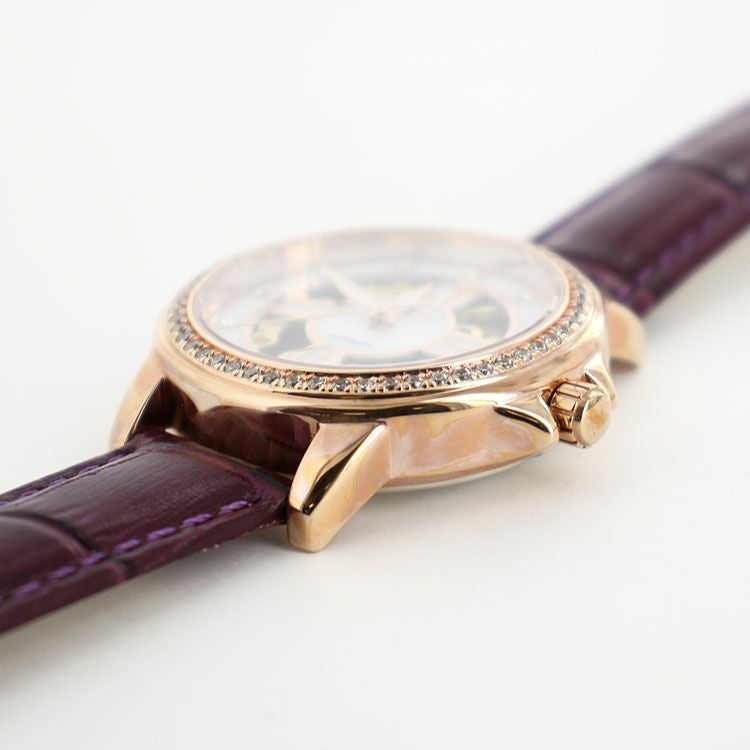 フェイスの中央からはその繊細な技術を見ることができる機械式タイプ。フェイス周りにキュービックジルコニアがあしらわられ高級感を演出しています。
