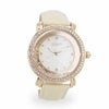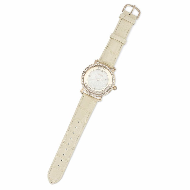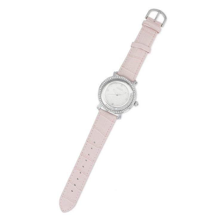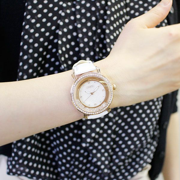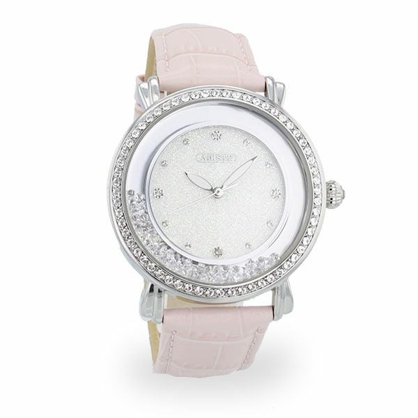 腕の動きに合わせてケース周りのクリスタルガラスも弾む、ラウンドフェイスのラメ入り時計。 ケース周りに並べられたクリスタルガラスが輝き、存在感のあるデザインです。大ぶりながら優しいベルトの色合いが女性らしさをアップしてくれます。