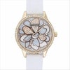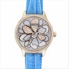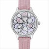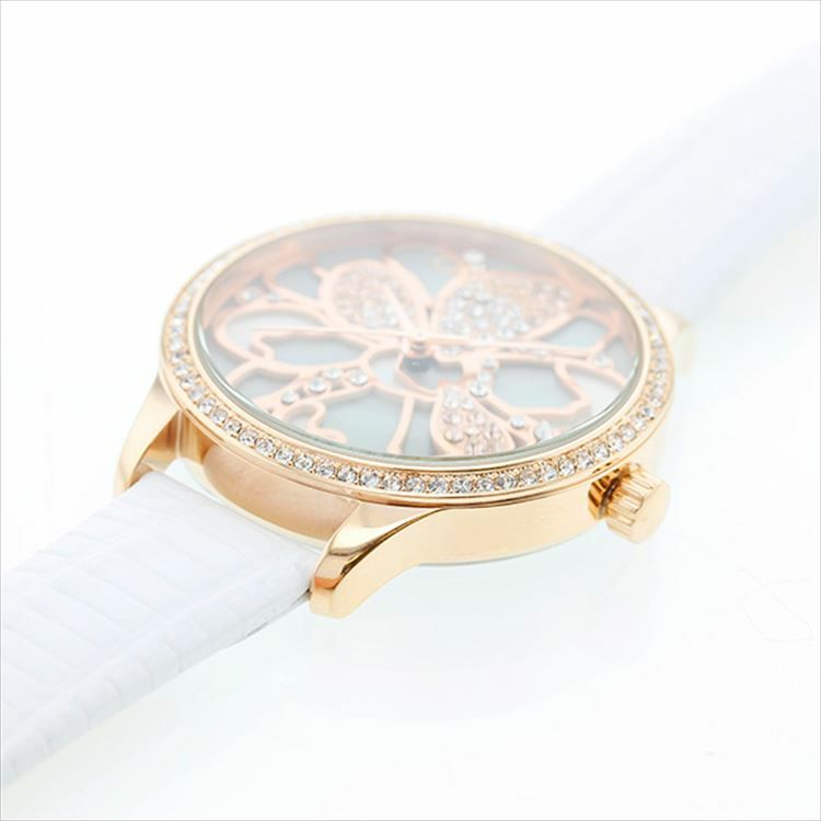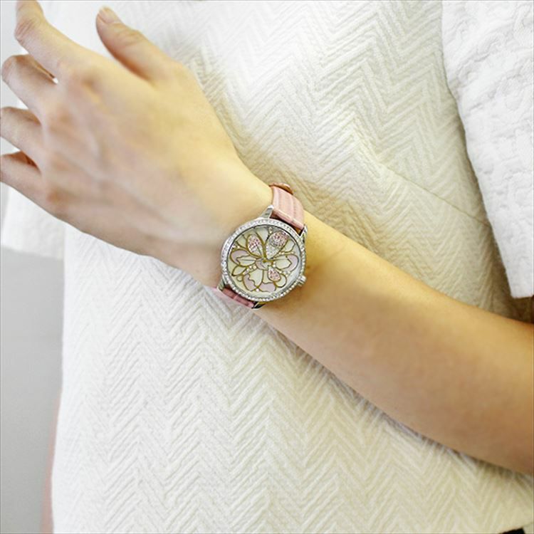 文字盤の中にお花柄があしらわれたエレガントな腕時計。MOPの上品な輝きと、グラデーションにあしらわれたチェコクリスタルガラスが、大人っぽく華やかなデザイン。