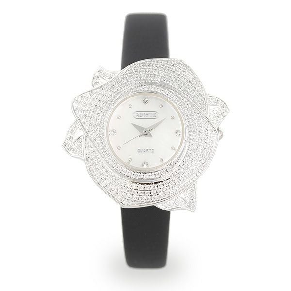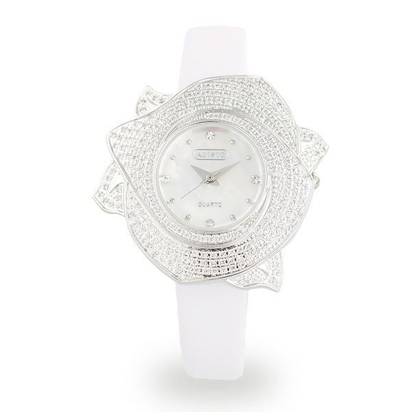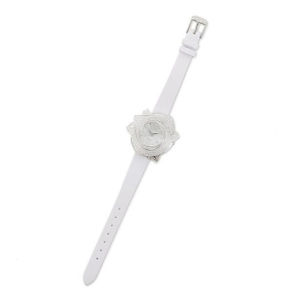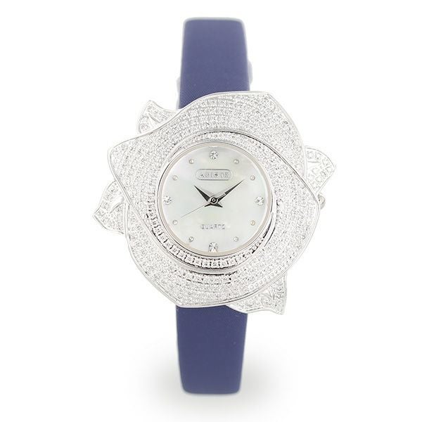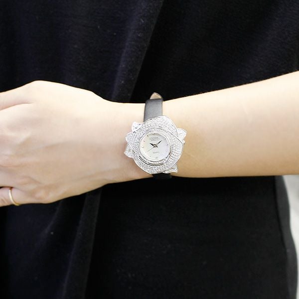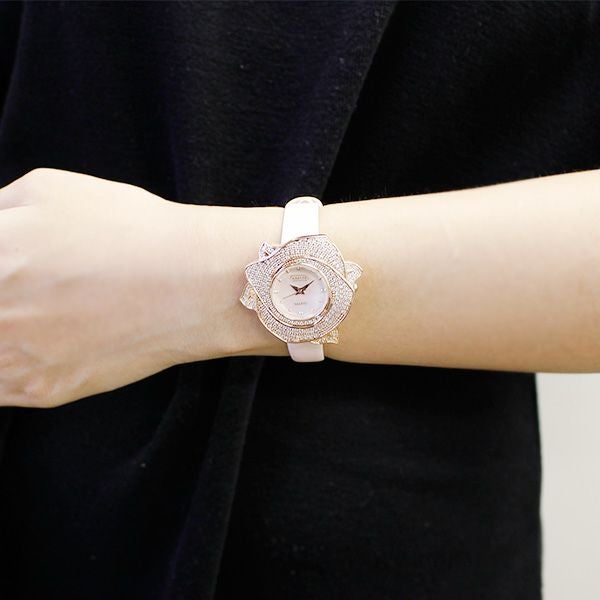 バラの花と4枚の葉をイメージしたフェイスにキュービックジルコニアを贅沢に施し、上品で可憐なデザインの腕時計。