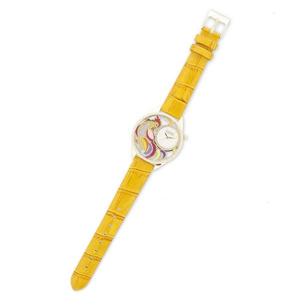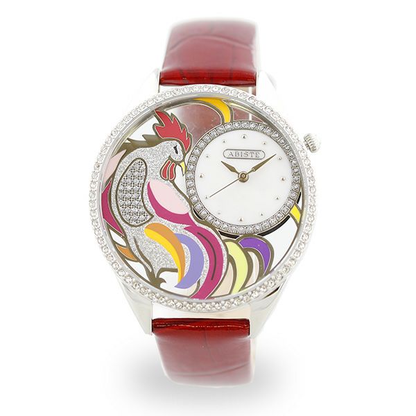 透かしになったフェイスにカラフルなルースターがデザインされた腕時計。