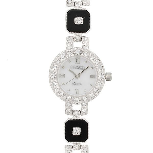 白蝶貝の文字盤に美しく輝くクリスタルガラスエレメンツ。ポイントにあしらわれたレインボージャスパーが個性的に腕元を演出するブレスレット時計です。