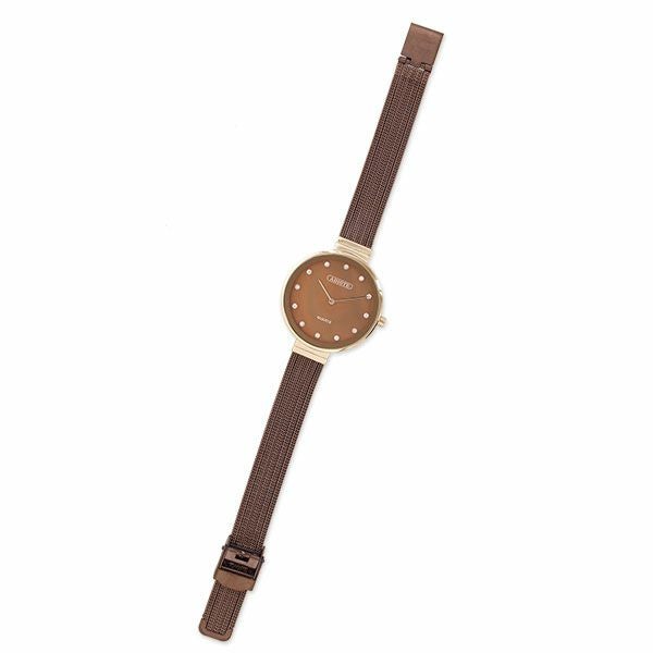 スッキリとした大きなフェイスと、文字盤にクリスタルガラスがあしらわれたシンプルなデザインの腕時計。世代や流行にとらわれず、長く愛せる洗練されたデザインの時計です。 スライド式留め具でご自身でサイズ調整が可能なので、コマ詰め不要でギフトにも最適☆