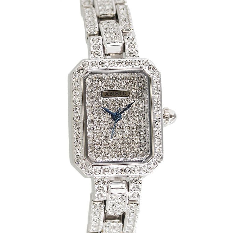 全面にクリスタルガラスが敷き詰められたまばゆい光を放つダイアルの中心には、ブルーの針。本体のシルバーカラーとの組み合わせがとても上品です。