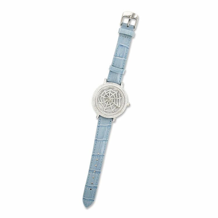 クリスタルガラスをパヴェ状に贅沢にあしらった華やかなベルト時計。秒針の先に小さな蜘蛛が遊び心を演出するフェイスには、クリスタルの蜘蛛の巣がキラキラと回転し、より華やかな雰囲気を演出します。