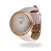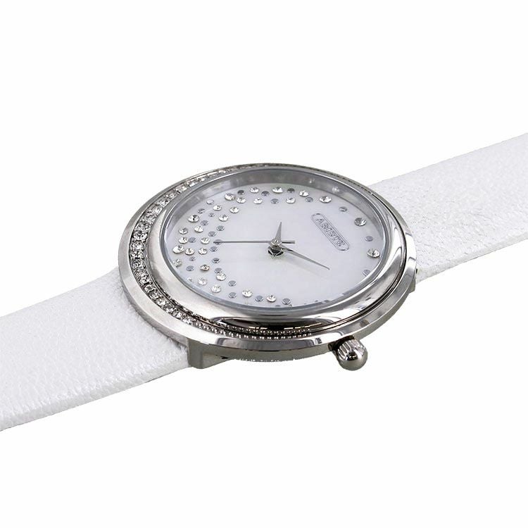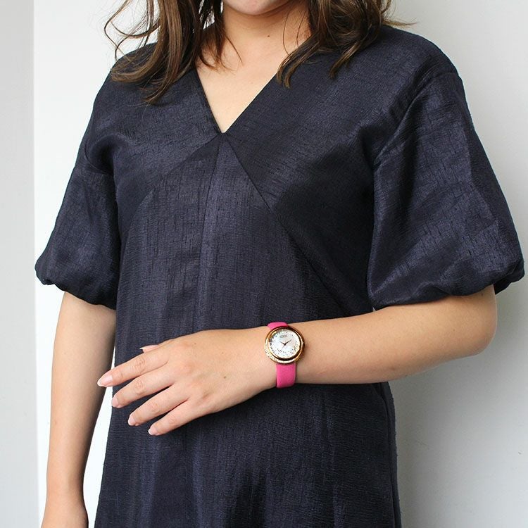 文字盤にチェコストーンがちりばめられたラウンドフェイス腕時計。ケースにも文字盤と同じようなイメージで、左下から右上にかけてクリスタルガラスが華やかにしきつめられ、洗練された大人かわいさを備えたデザインです。普段使いはもちろん、オフィス使い、パーティーシーン、プレゼントにもおすすめです。