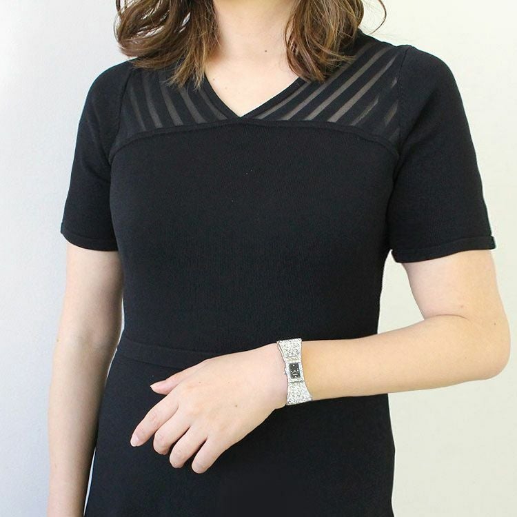 大きなリボンにチェコクリスタルガラスが敷き詰められた大人かわいいベルト時計。しっかりリボンが感じられる存在感のある大きさはジュエリー感覚でもご利用いただけます。