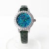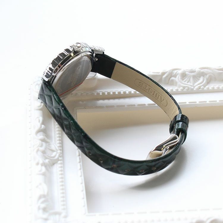 人工オパールの文字盤の遊色が美しいラウンドベルト時計。ベゼルにはチェコストーンが囲み、キラキラと煌めくクラス感を演出。インデックスには一般的なクリスタルよりもカット数が多く、美しい輝きが特徴のクリスタルガラスを使用しています。ご自分用はもちろん、プレゼントにも最適です。