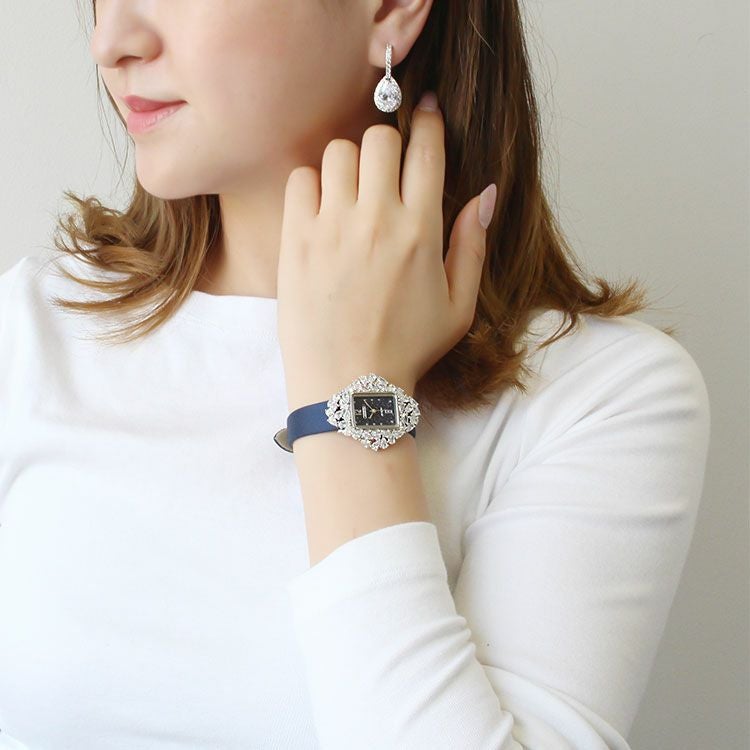 キュービックジルコニアをふんだんにあしらったラグジュアリーな腕時計。レクタングルフェイスの文字盤は、ブラックに近い深みのあるネイビーに、細かいキラキラの粒が美しく煌めく石を使用。まるで星空のような、ロマンチックな輝きを宿します。