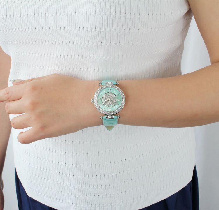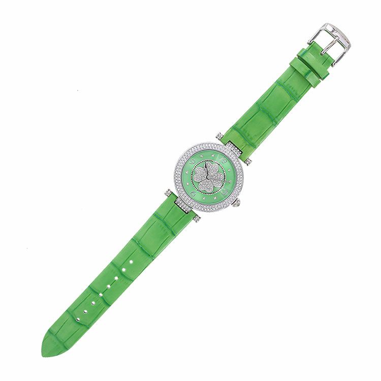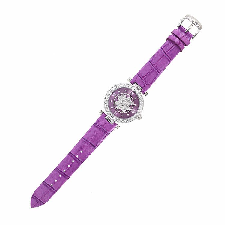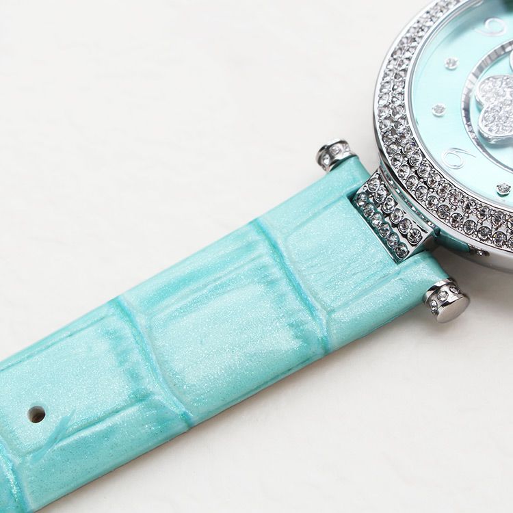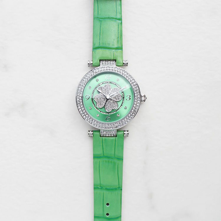 動くたびにクローバーモチーフがクルクルと回転する腕時計。微細なラメ感のある革ベルトは、防水加工を施した牛革を使用しています。オーストリア製クリスタルガラスを随所にふんだんに用い、まるでジュエリーウォッチさながらの華やかさに。