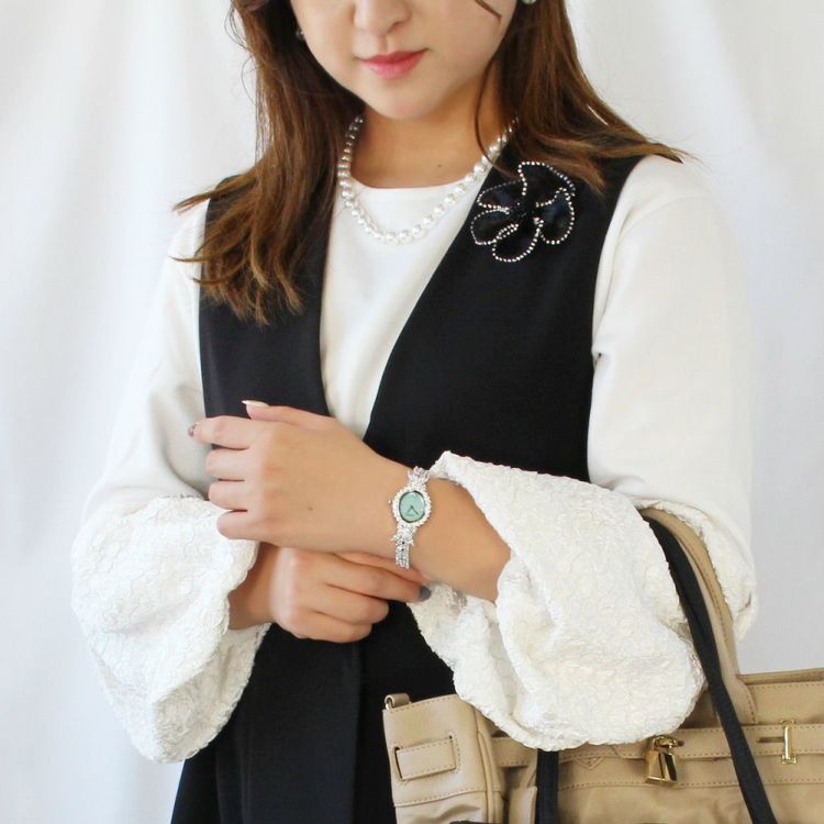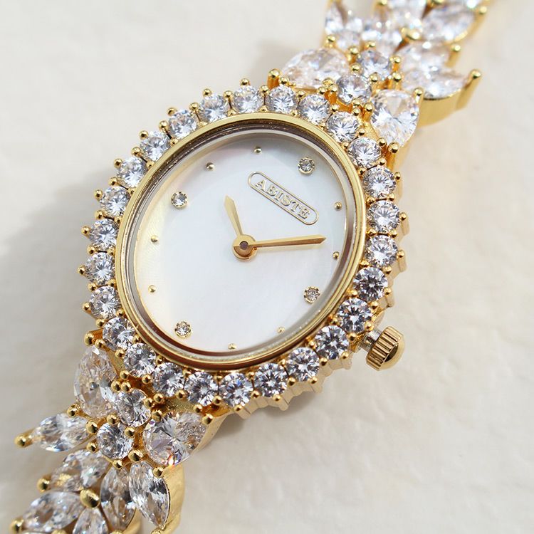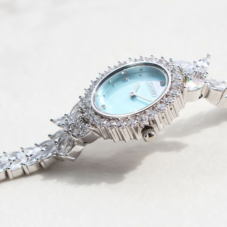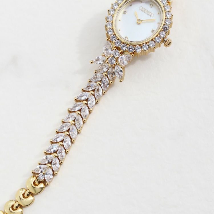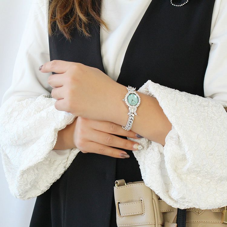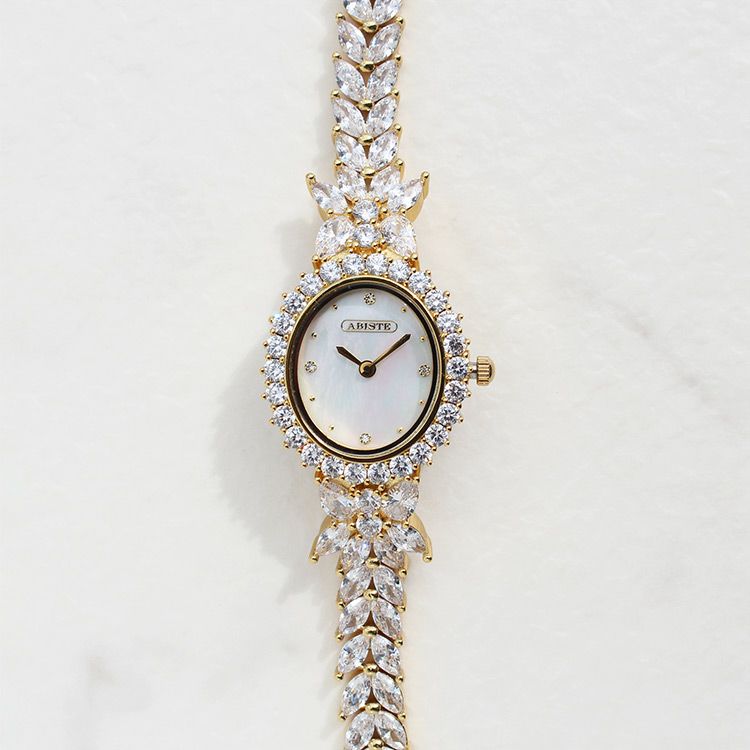 まるでジュエリーのように華やかなブレスレット時計。品よく視認性も良いやや小ぶりなオーバルフェイス。ドットインデックスで時刻も見やすく、3.6.9.12部分にはポイントストーンがあしらわれています。