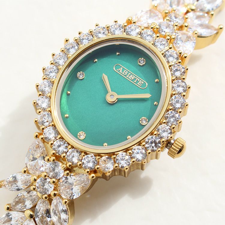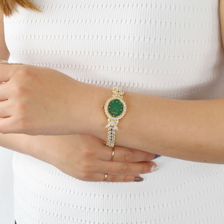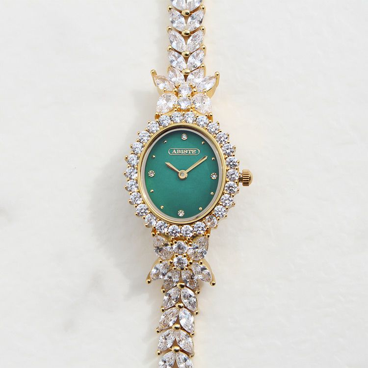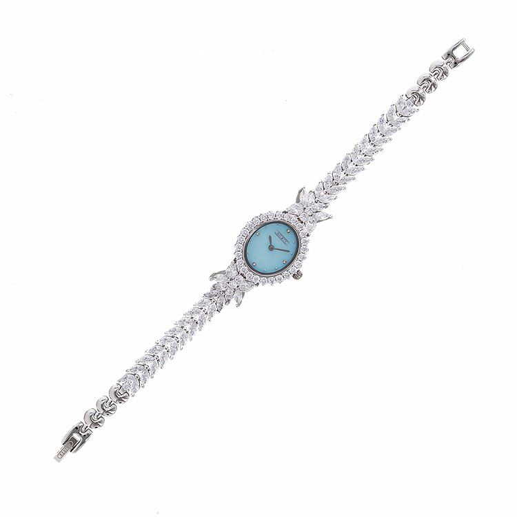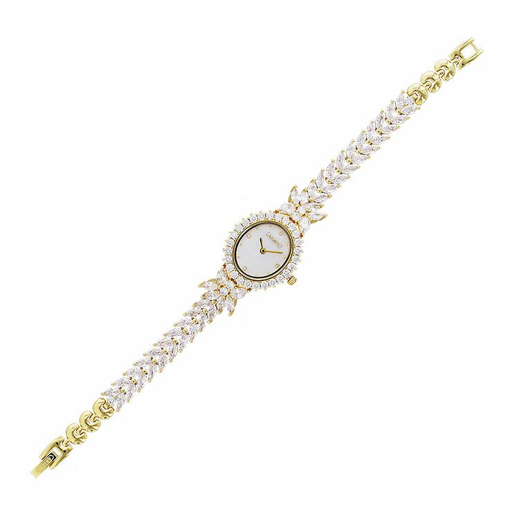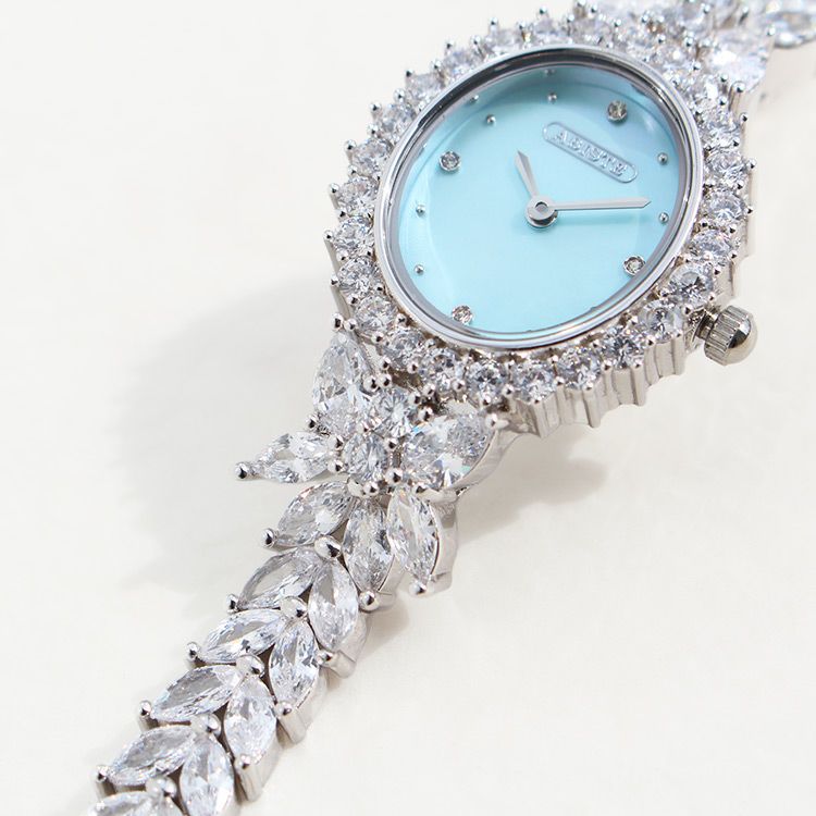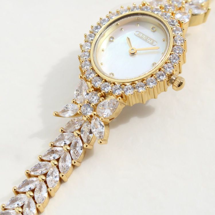 まるでジュエリーのように華やかなブレスレット時計。品よく視認性も良いやや小ぶりなオーバルフェイス。ドットインデックスで時刻も見やすく、3.6.9.12部分にはポイントストーンがあしらわれています。