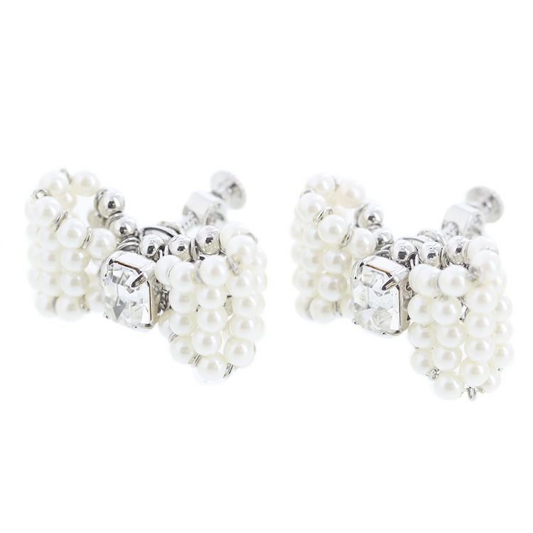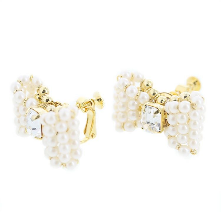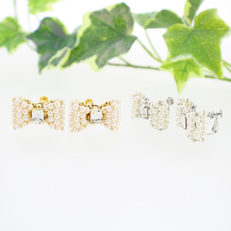 【日本製】リボンモチーフビジュー付きパールイヤリング/3220005