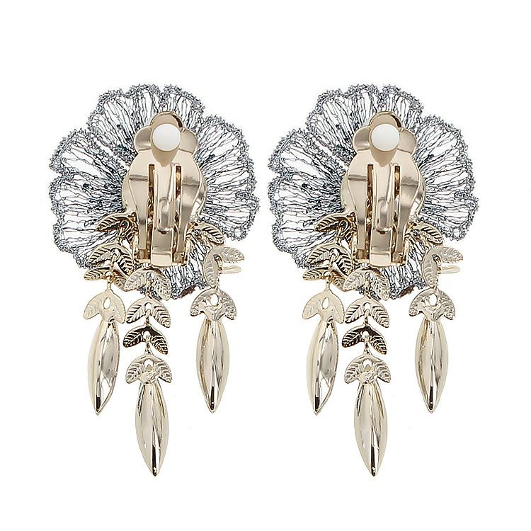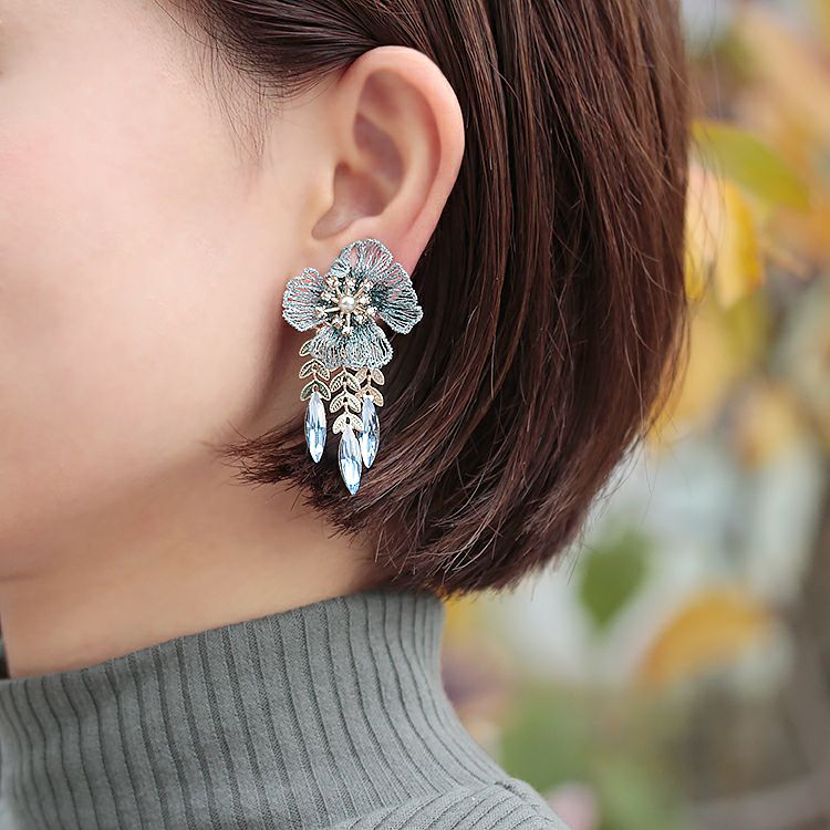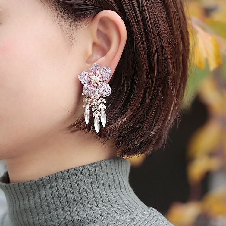 メッシュフラワーモチーフクリスタルガラスロングイヤリング/3191002
