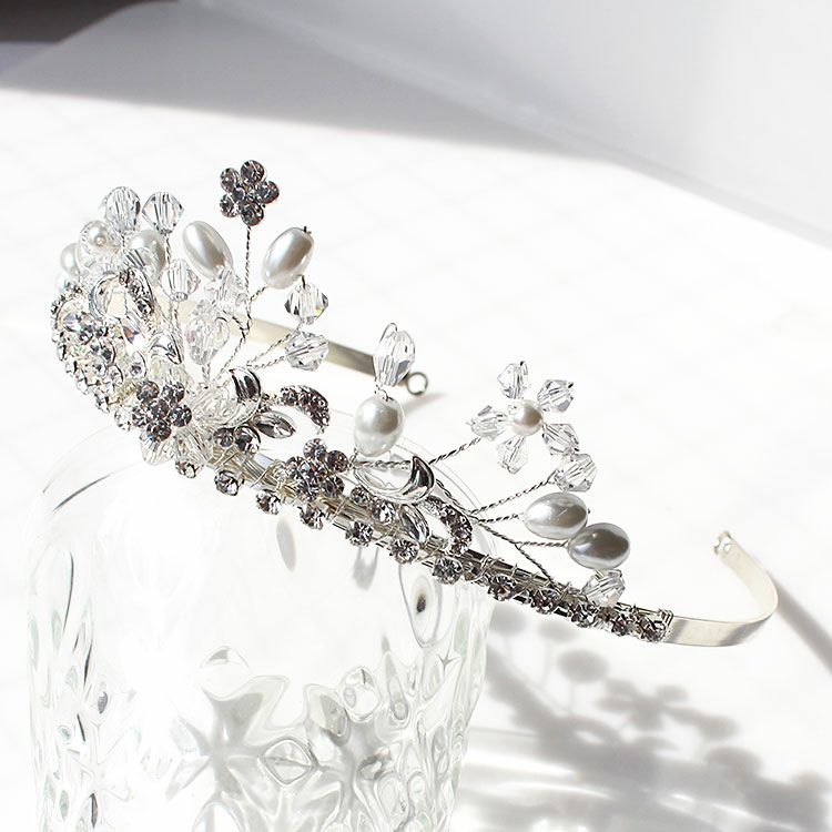 クリスタルガラスとパールのお花がキュートなプリンセスティアラ。高めの位置にセットすればプリンセス感漂うキュートなシルエットに。縦横のバランスが良いのでどんなドレスにも似合います。柄の部分は若干伸び縮みするので多少の幅調整は可能です。