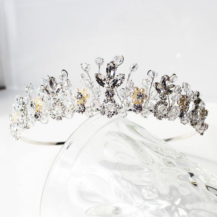 クリスタルガラスのリーフモチーフにパールのお花がキュートなブライダルティアラ。ナチュラルやシンプルなドレスにも似合います。柄の部分は若干伸び縮みするので多少の幅調整は可能です。
