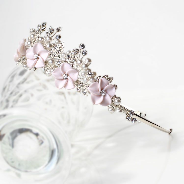 クリスタルガラスのリーフモチーフにパール、ほんのり薄いピンクのフラワーモチーフがキュートなブライダルティアラ。ナチュラルやシンプルなドレスに似合います。お花が横を強調するので面長の方にもおすすめ。柄の部分は若干伸び縮みするので多少の幅調整は可能です。