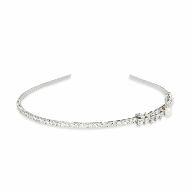 キュービックジルコニアとパールが煌めく、品の良いデザインのカチューシャ。さりげなく身につけられるサイズ感なので他のアクセサリーや服を選ばず、日常からブライダルシーンやパーティー、ステージなどでの特別な装いまで幅広いシーンを彩ります。