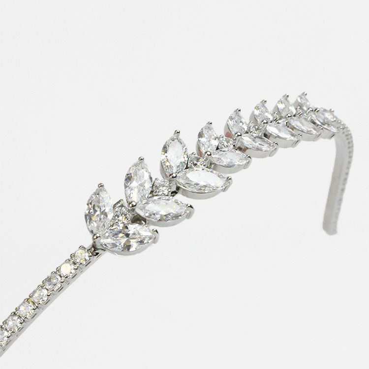 マーキスシェイプのキュービックジルコニアをあしらった、品の良いデザインのカチューシャ。マーキスシェイプは光を強く放つリーフ型。華やかな煌めきで日常からブライダルシーンやパーティー、ステージなどでの特別な装いまで幅広いシーンを彩ります。