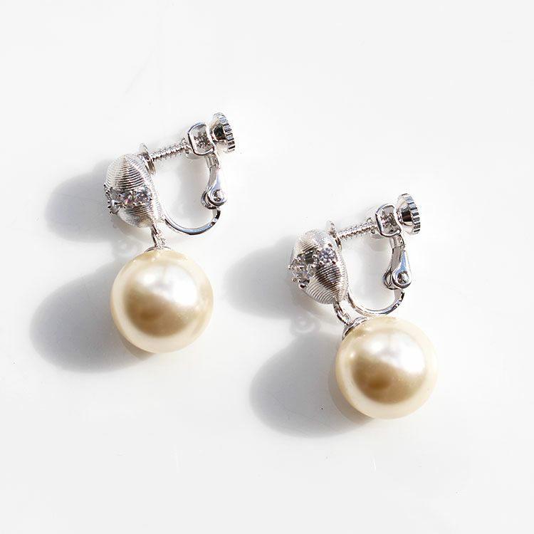 大粒のガラスパールがしなやかに揺れるデザインイヤリング。メタル部分に斜めラインにデザインされたキュービックジルコニアが耳元を華やかに演出してくれます。普段使いからパーティーシーンまで幅広くお使いいただけます。