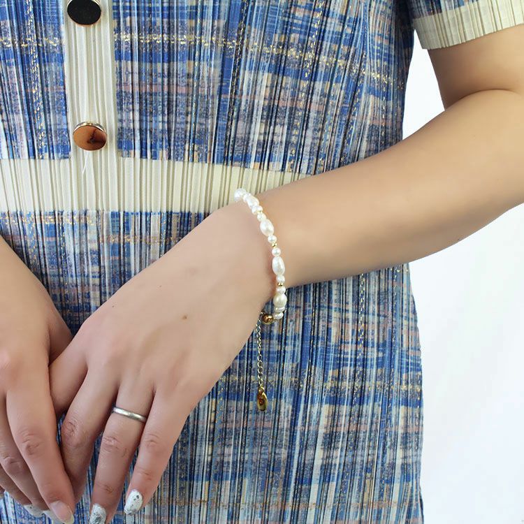 やわらかくなめらかな輝きを放つ大小淡水パールが配置されたデザインブレスレット。ゴールドのメタルビーズがアクセントになってキリっと洗練された雰囲気を印象付けています。カジュアルはもちろん、オフィス使い、フォーマルまでさまざまなシーンでお使いいただけます。