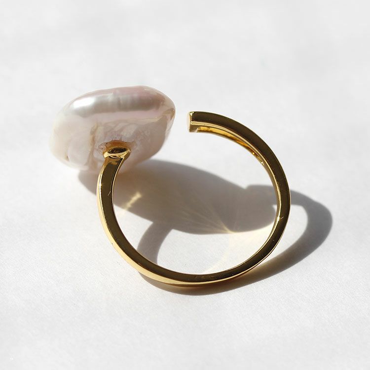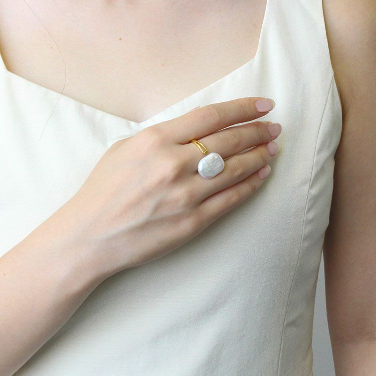 大ぶり平ドロップ型の淡水パールのデザインリング。やわらかい光沢感と天然ならではの色合いが洗練された大人のデザインになっています。パーティーシーンや会食、外出時、デイリー等幅広くご利用いただけます。