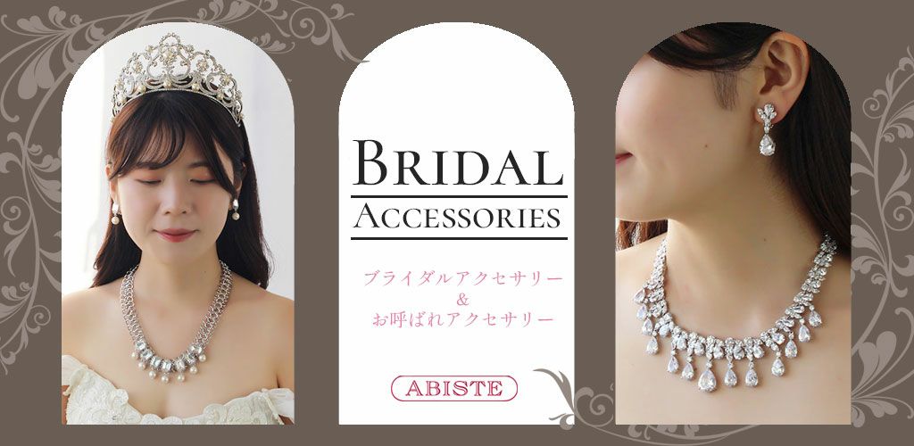 ブライダルアクセサリーならアビステ。ご自分らしいウエディングを叶えるため、ときめくアクセサリーを多く取り揃えております。王道のティアラやカチューシャティアラをはじめ、胸元を華やかに飾るネックレスとイヤリングのセットアクセサリー、ネックレス、イヤリング、ピアス、ブレスレット、ゲストのためのお呼ばれアクセサリーをご用意しています。パーティーや演奏会、舞台や衣装、普段使いにご使用いただけるものもございます。ぜひご利用ください。