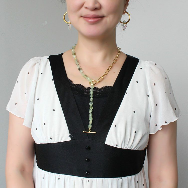 天然石(プレナイト)とチェーンのコンビネーションが新鮮なショートネックレス。爽やかなライトグリーンが涼しさを演出します。