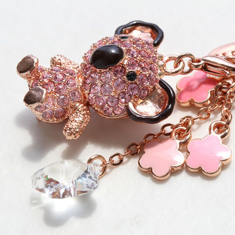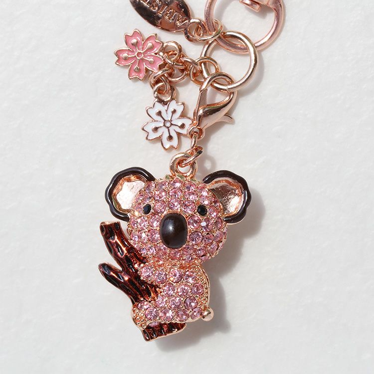 優しいピンクのコアラをモチーフにしたキーホルダー。フラワー型のチャームもセットになったデザインで、裏面もお花模様の透かしになっています。