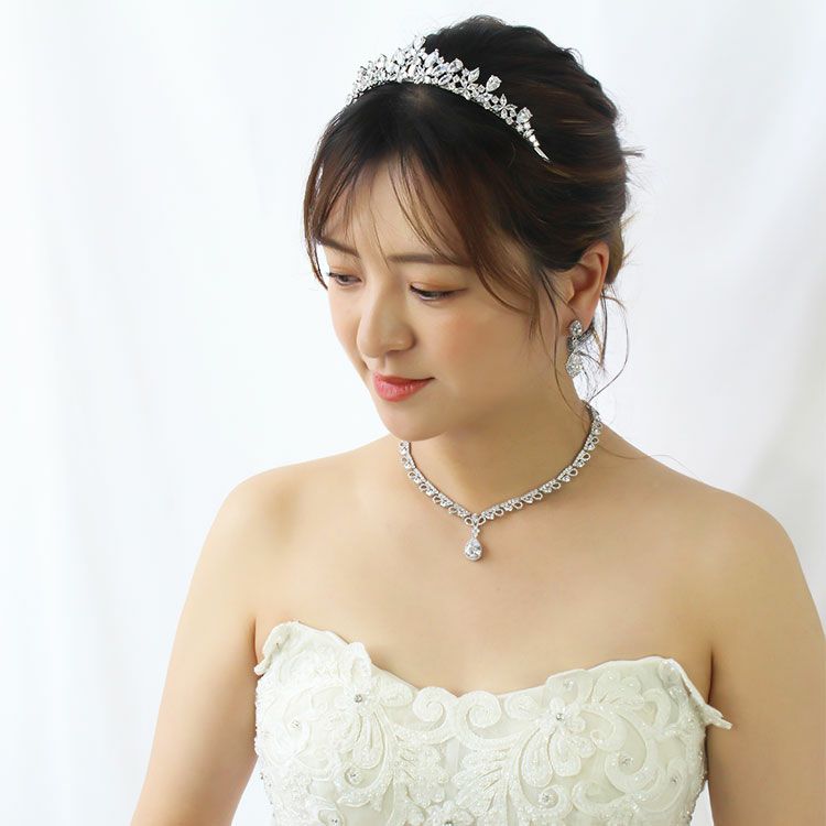 リーフシェイプとドロップシェイプの大粒キュービックジルコニアをたっぷりとあしらった、煌びやかでエレガントなプリンセスティアラ。ブライダルシーンやステージなどでの特別な装いを彩ります。