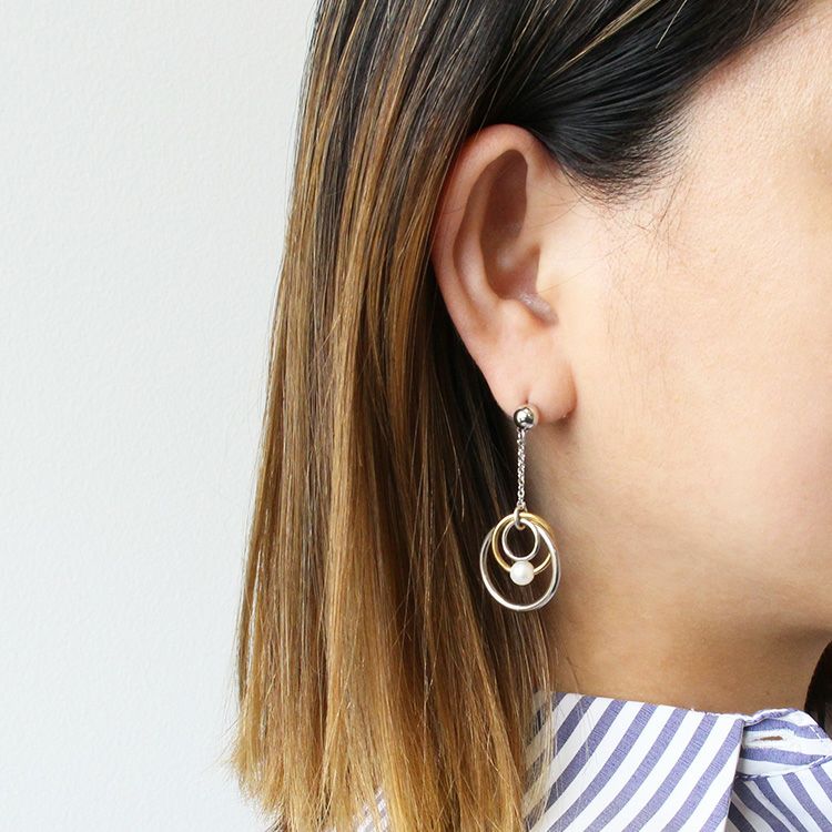 淡水パールとフープメタルを組み合わせたラウンドピアス。フレンチシックに織り交ぜたコレクションは、大ぶりになりすぎず、普段使いにおすすめです。